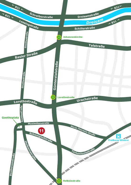 die Innenstadt (Bertholdsbrunnen). Die nächsten Haltestellen sind die Lorettostraße oder die Holbeinstraße.